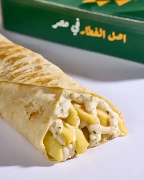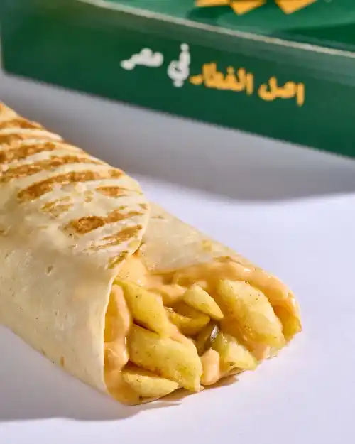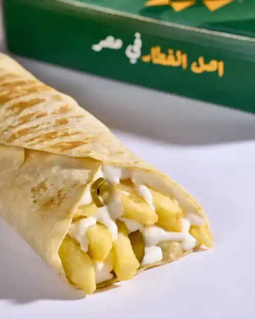 طعمية مقرمشة وساخنة، عليها بطاطس طرية وقطع جبنة رومي غنية، مع طبقة فلفل أخضر وطماطم طازة، ولمسة زيتون لزيادة النكهة والقرمشة.