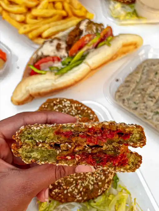 قرص طعمية محشية بالحشوة الحارة، مقرمشة من الخارج وساخنة من الداخل، مع طبقة سلطة طازة لإضافة انتعاش ولمسة طحينة كريمية تزيد النكهة غنى.