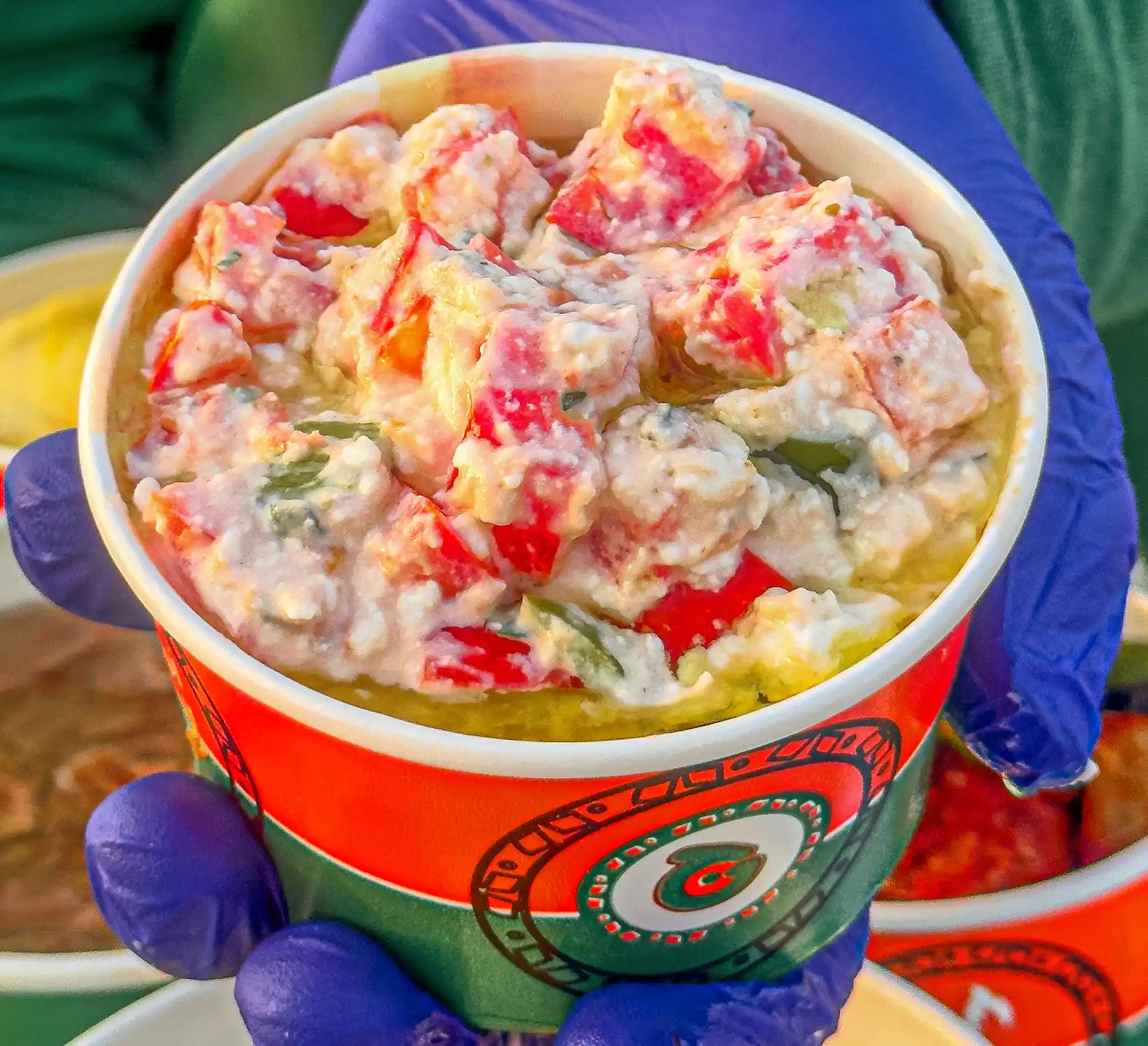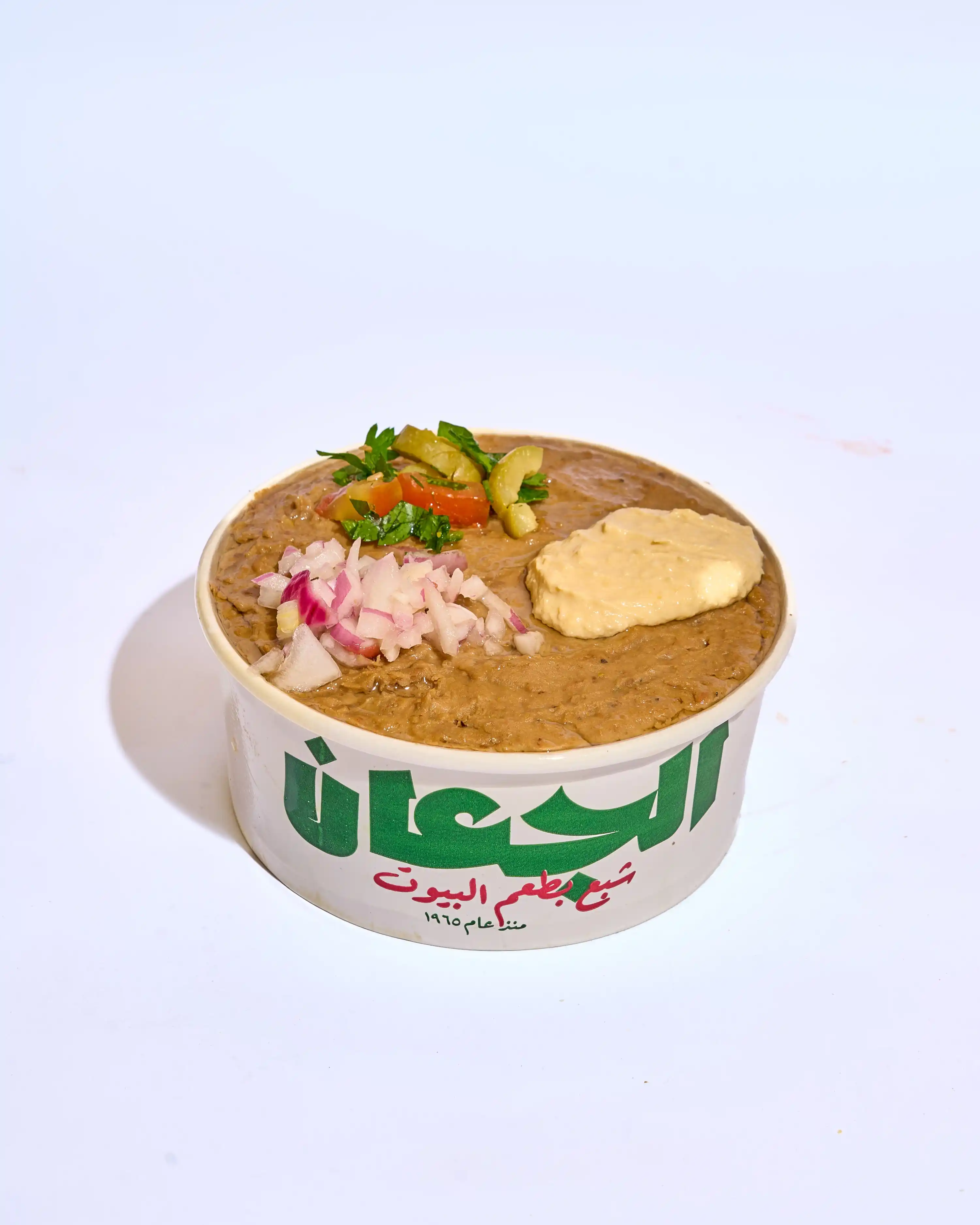 فول دافئ متسبّك على أصوله، يعلوه طبقة طازة من السلطة الفريش مع رشة طحينة كريمية تضيف نعومة وطعم غني.