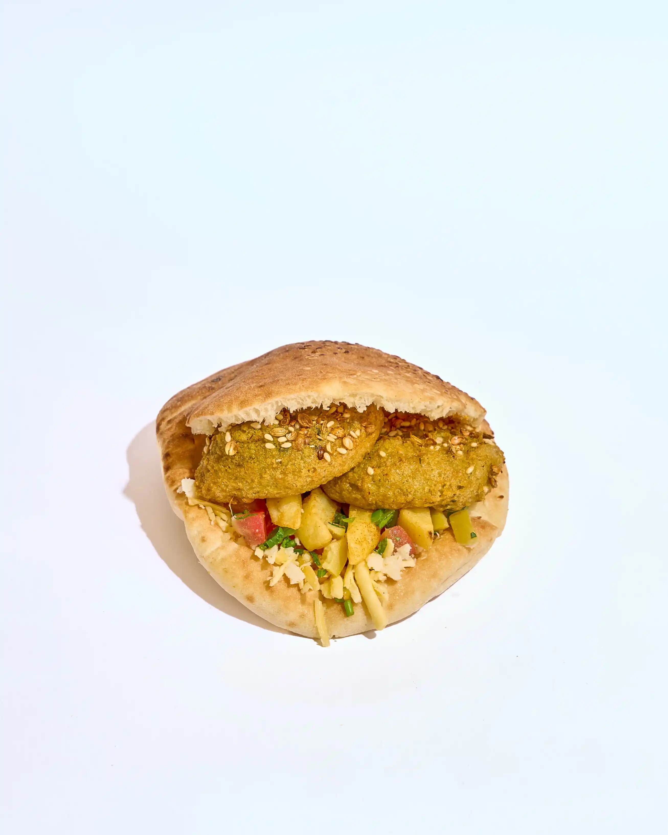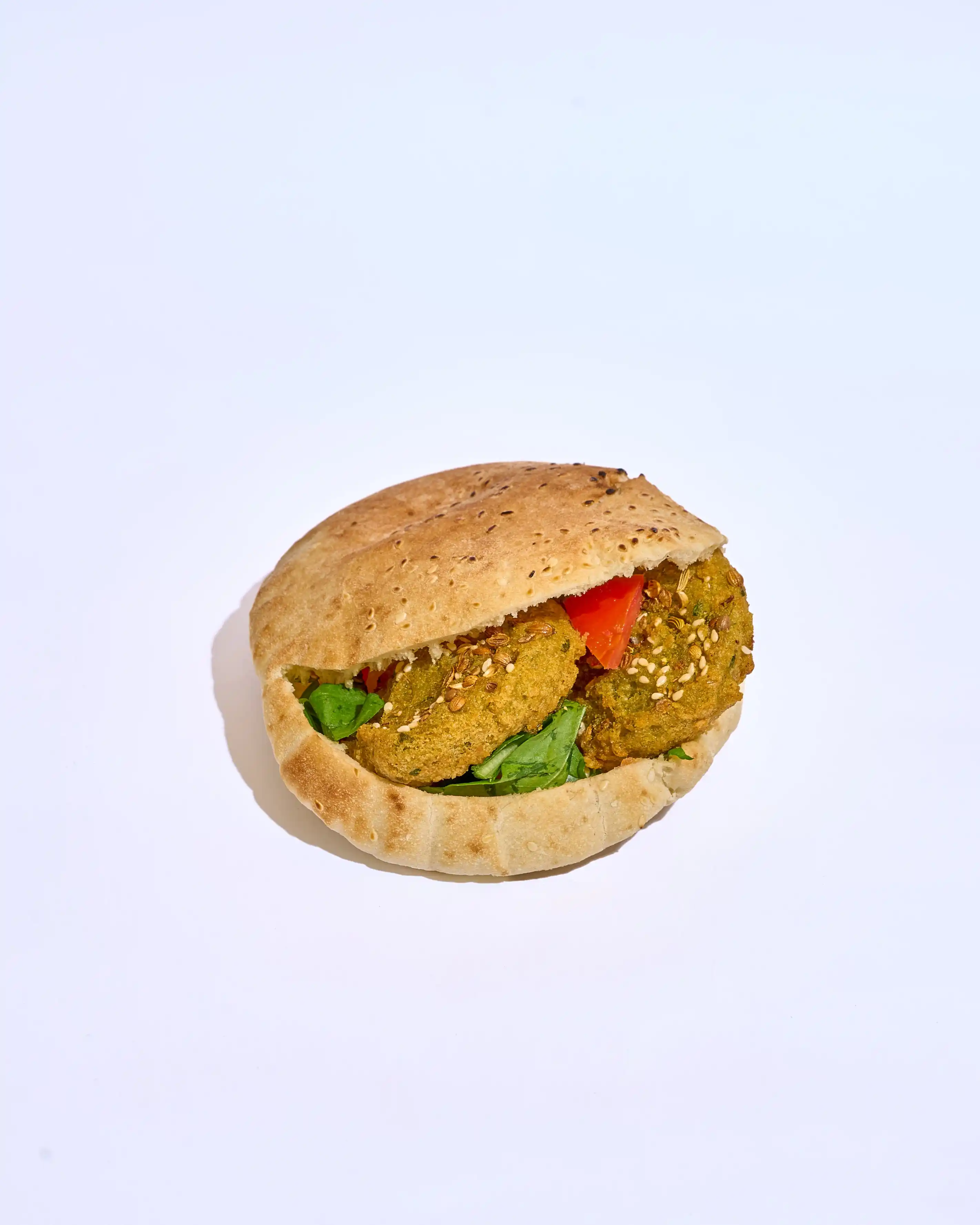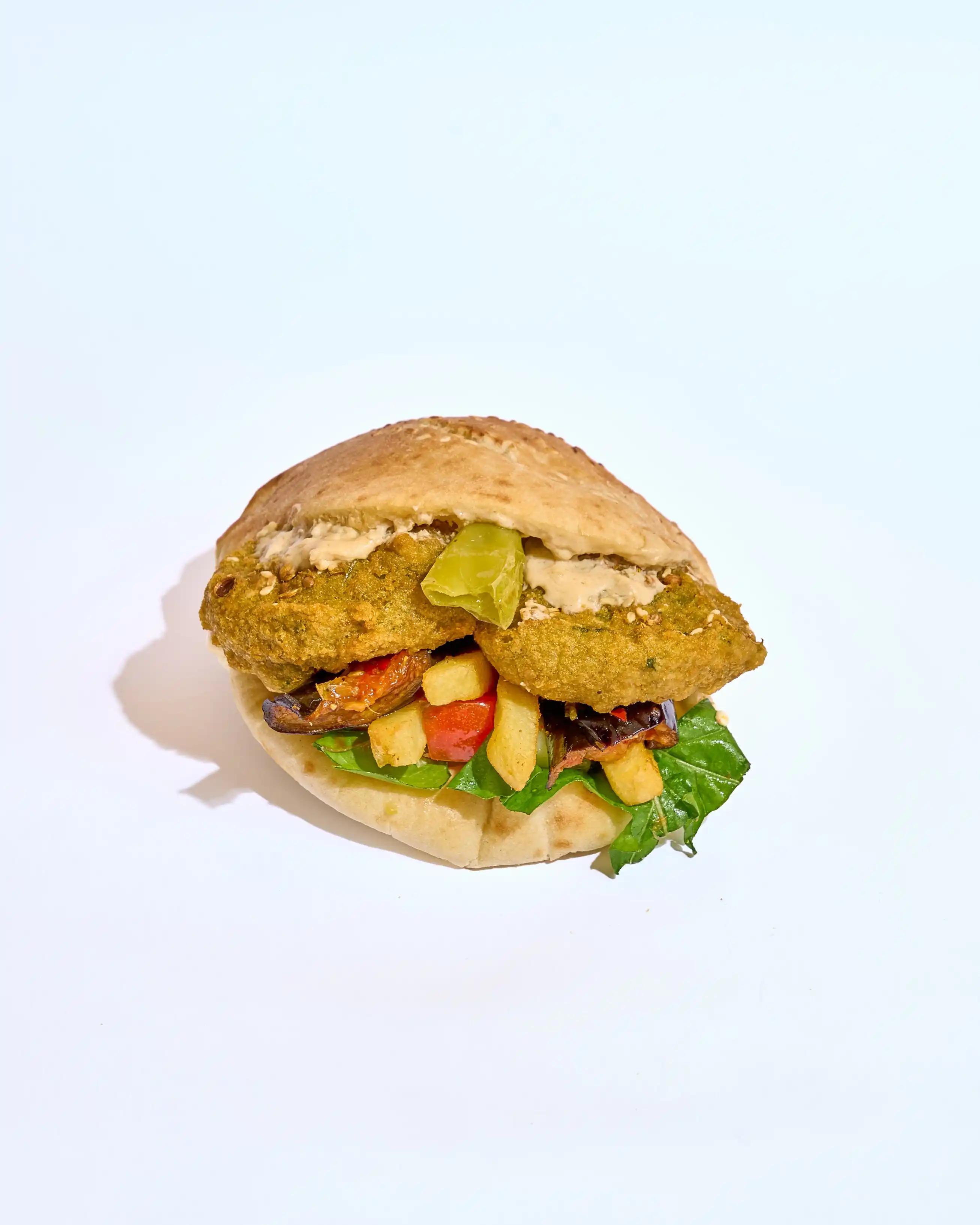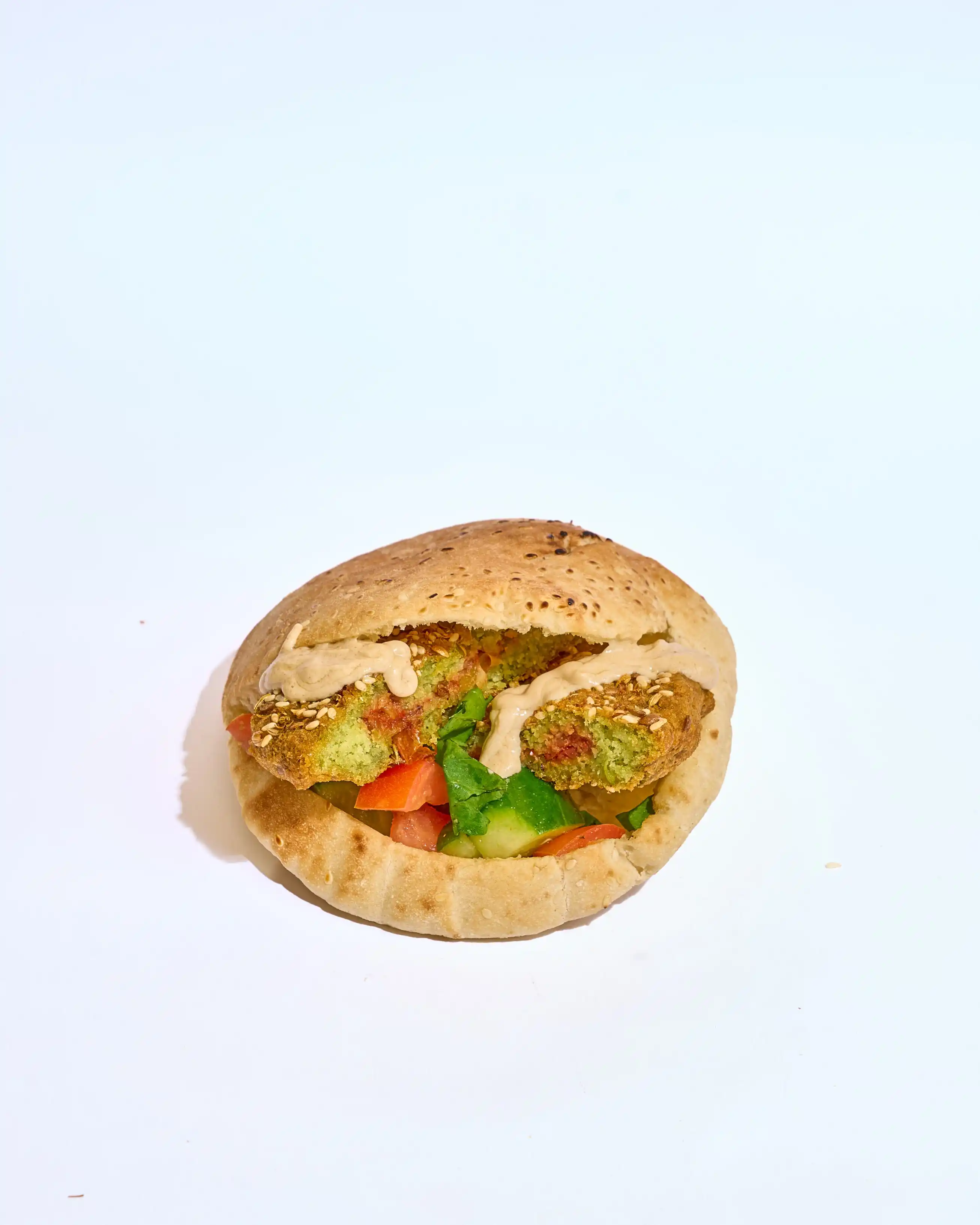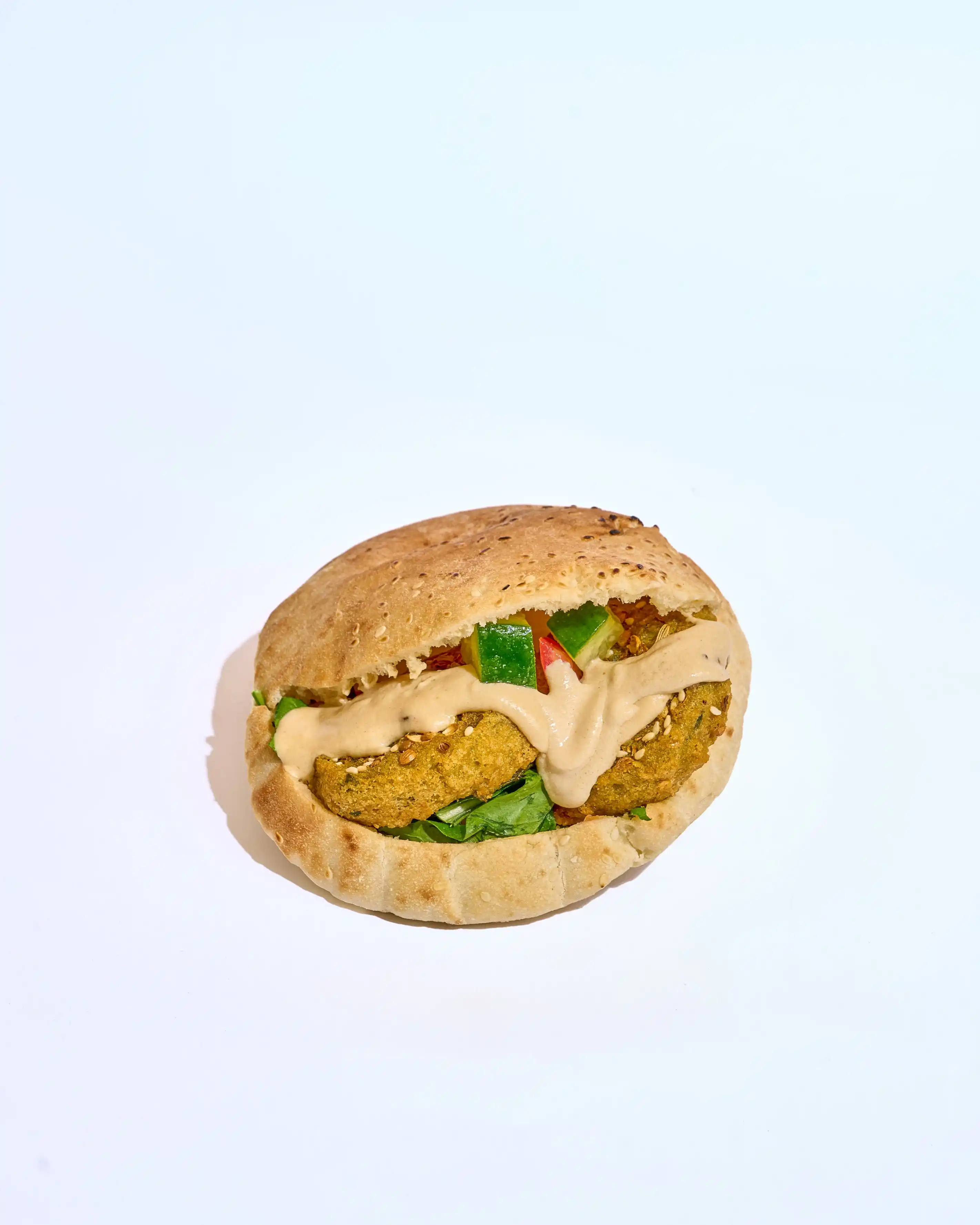 طعمية مقرمشة وساخنة، محشوة بخيار وطماطم طازة لإضافة قرمشة وانتعاش، مع كابوتشي طري ولمسة طحينة كريمية تغني كل لقمة بالنكهة الغنية والمتوازنة.