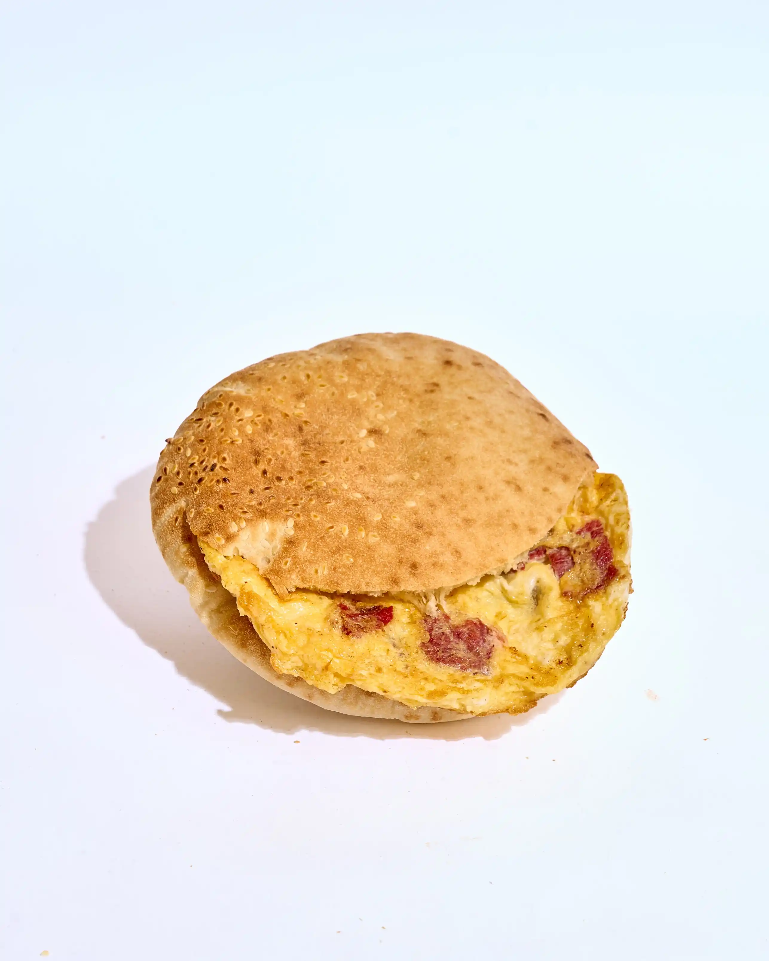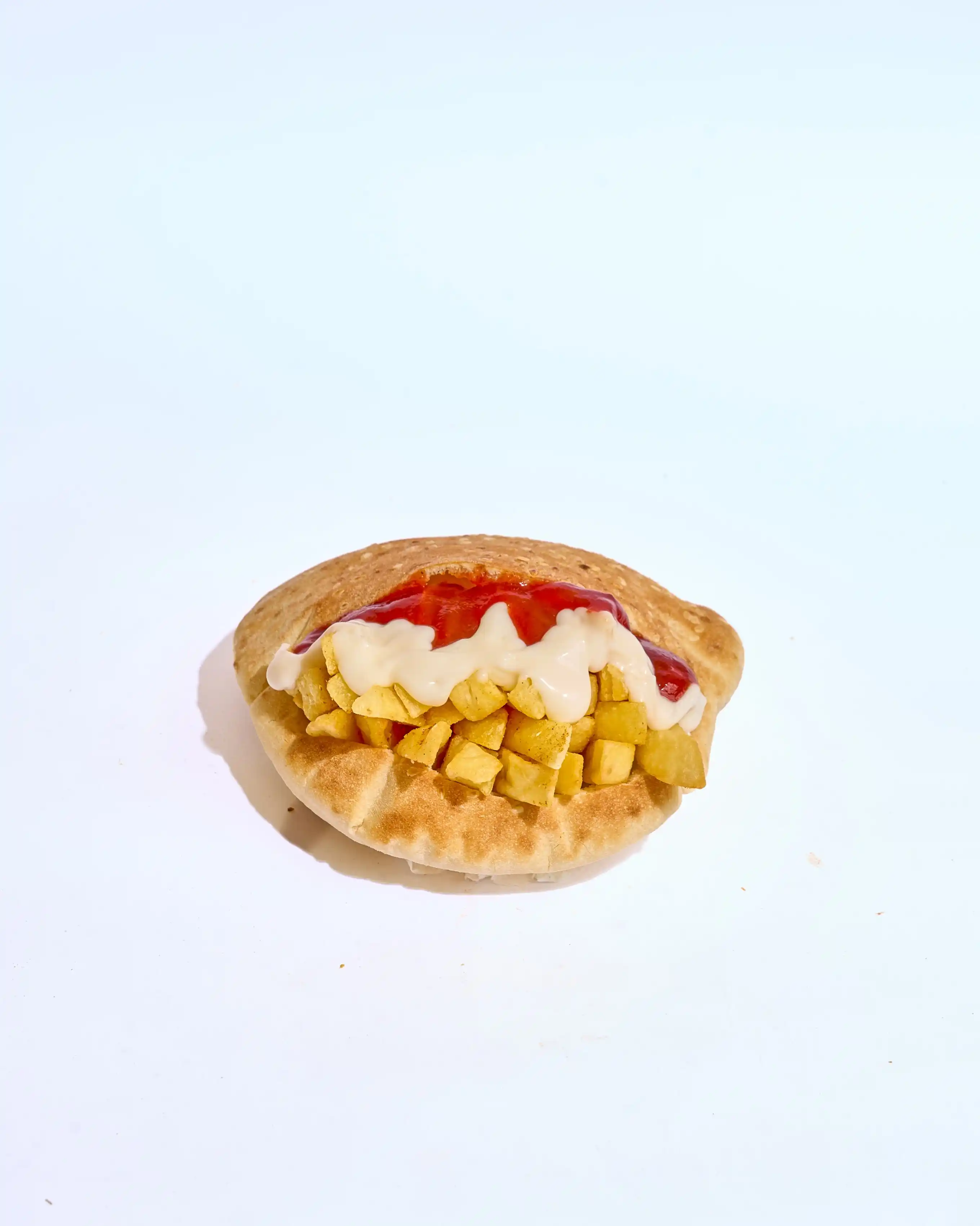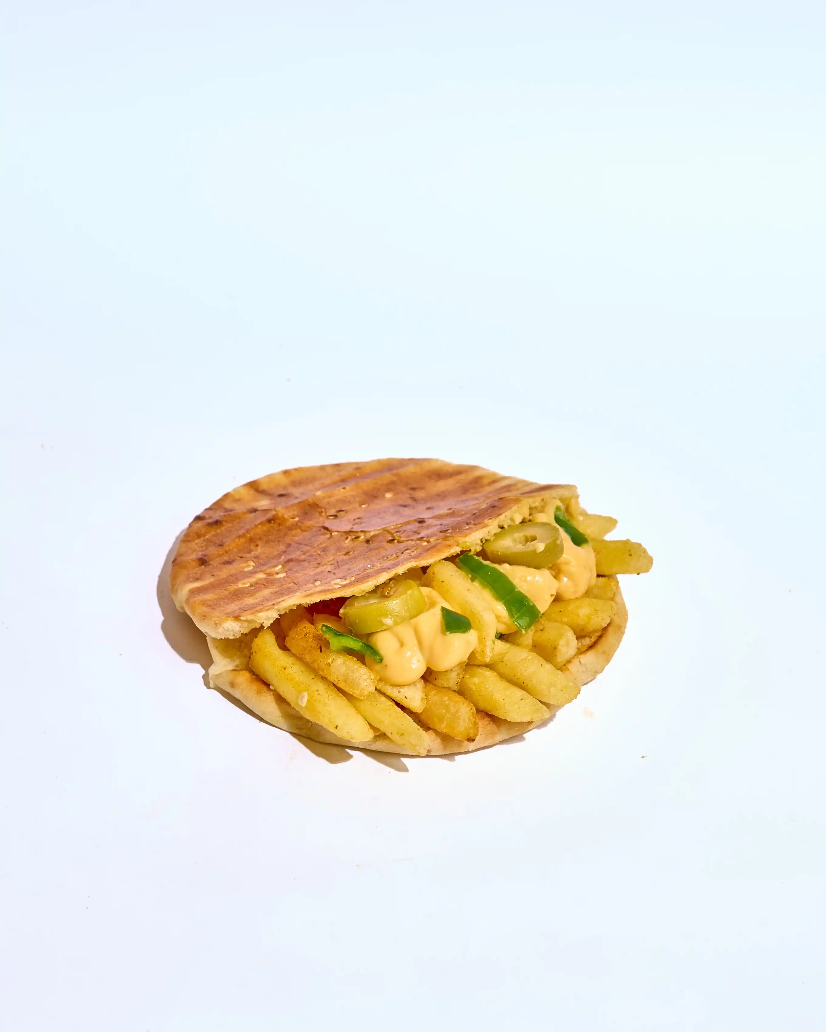 (عيش طازة متحمّر محشو بطبقة كيري كريمية سايحة، متغطية بفلفل ألوان طازة وزيتون يدي طعم مميز في كل قضمة بيتقدّم مع بطاطس مقرمشة، صوص تومية سبايسي يزوّد الإحساس، وظرف كاتشب على الجنب عشان تكمل المتعة.