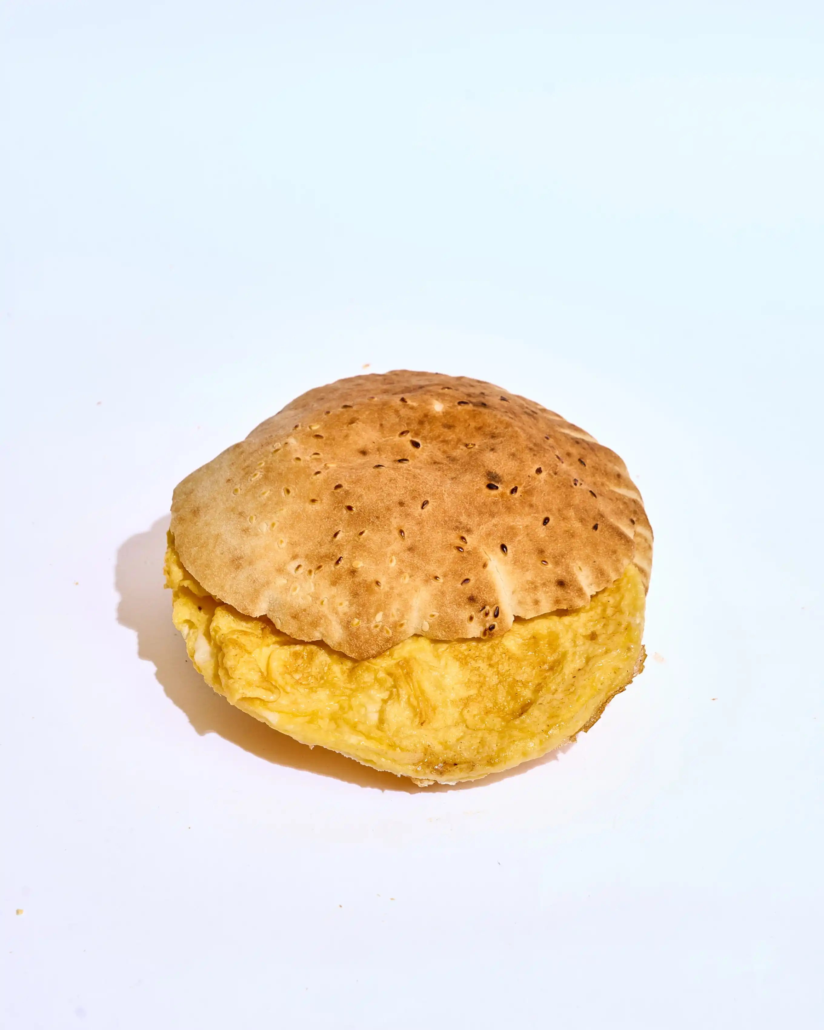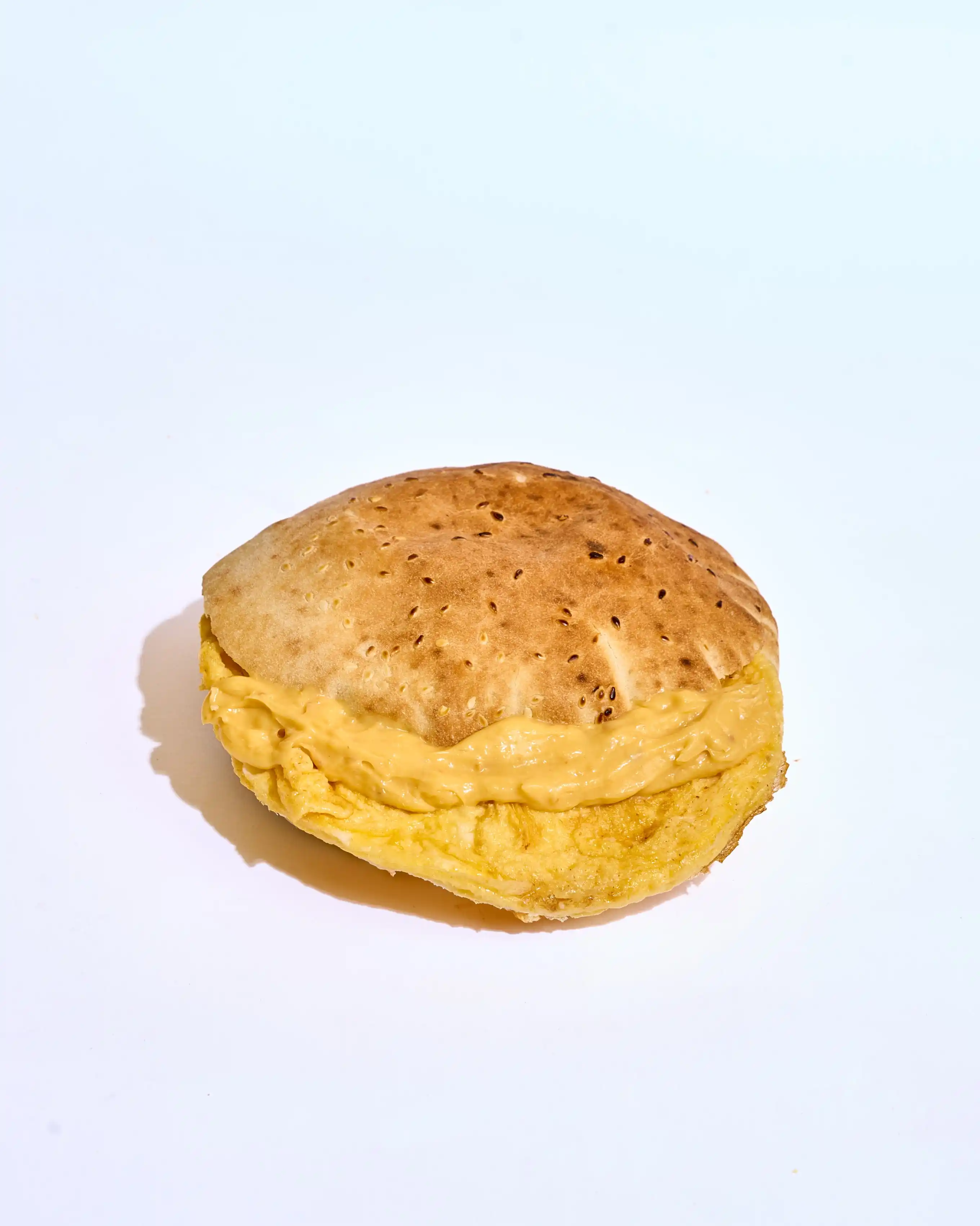 بيضة مقلي طازجة مع نصف قطعة كيري، جبنة موتزاريلا، رومي وميكس جبن ذائب، لمسة سمنة وزيت، مع رشة فلفل تضيف الطعم المثالي.