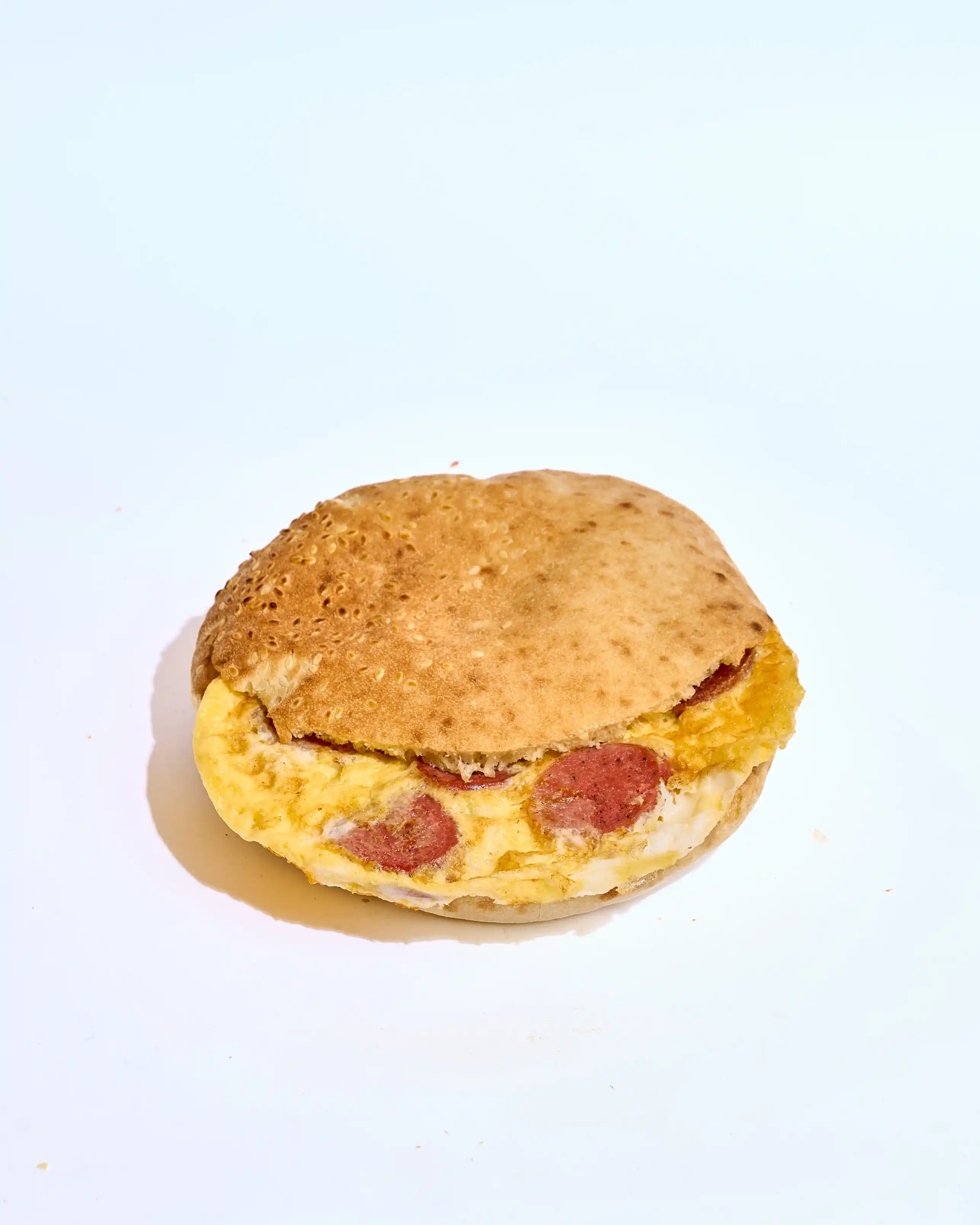 ساندوتش أومليت سوسيس بسيط وشهي، يجمع بين البيض الطري والسجق اللذيذ مع لمسة سمنة وزيت وملح ورشة فلفل للنكهة الكاملة.